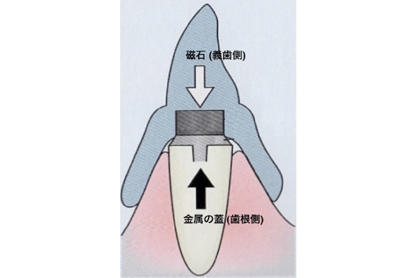 磁石は入れ歯側に入れ、歯の根(歯根)には磁石が付く金属を設置します。